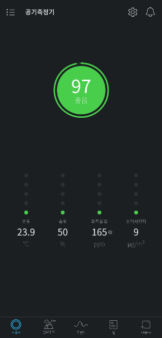 하단에는 공기질 스코어 및 그래프 / 온도 / 습도 / 화학물질 / PM2.5 / 시계 중에 하나만 표시됩니다